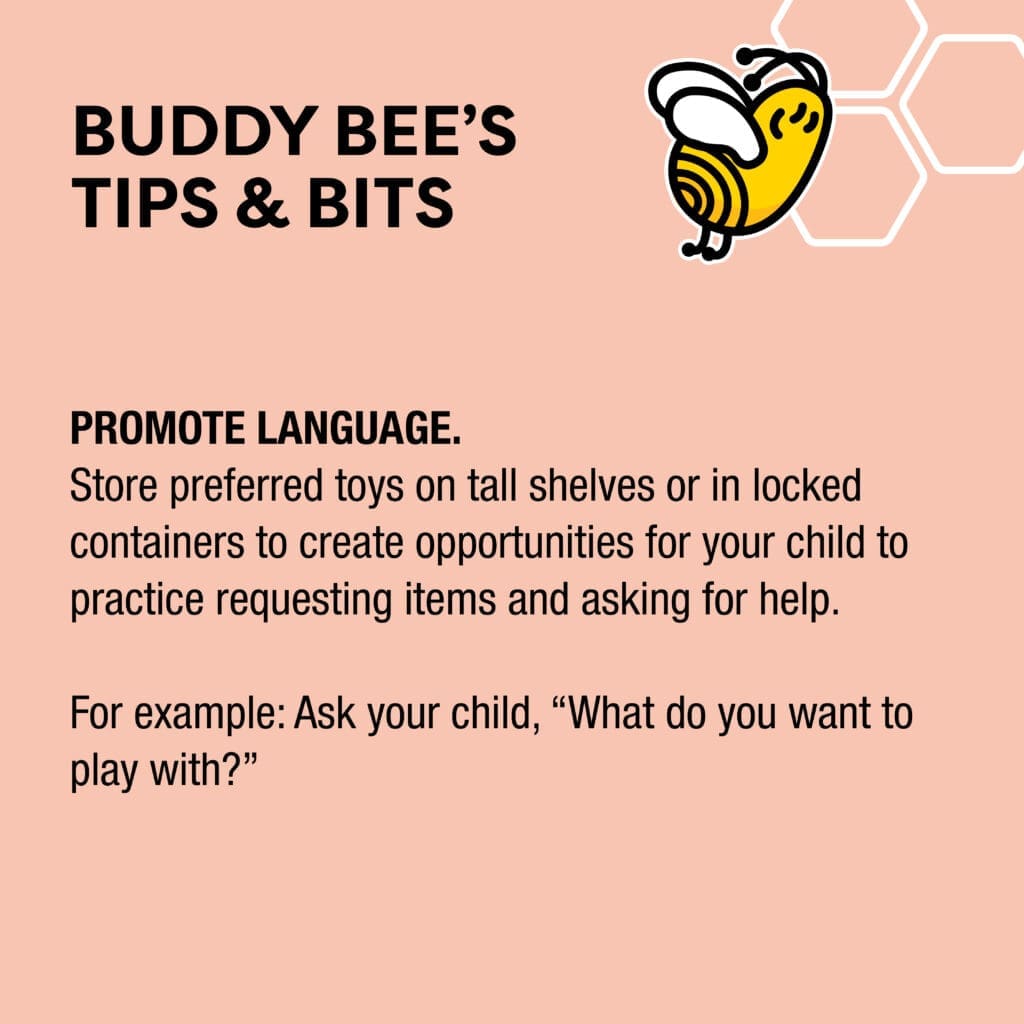 Store preferred toys on tall shelves or in locked containers to create opportunities for your child to practice requesting items and asking for help.