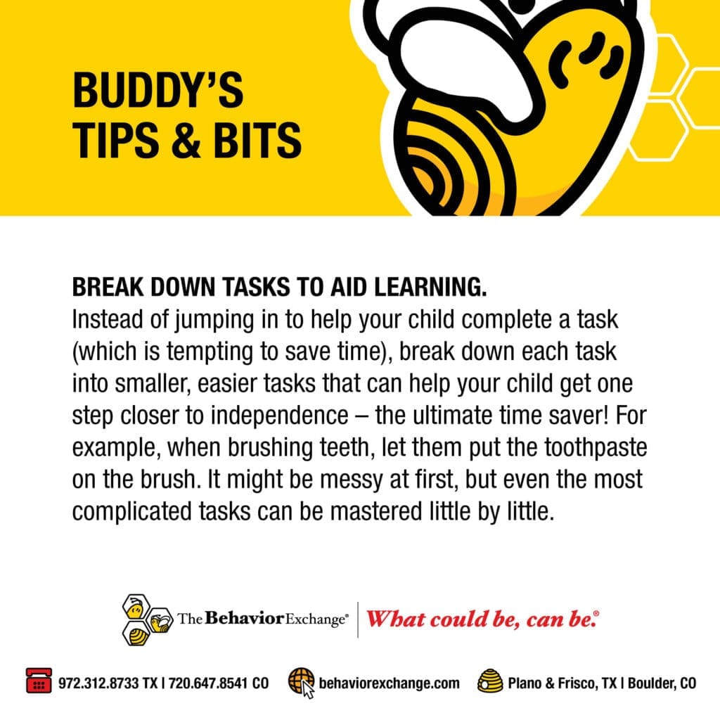 Break down tasks to aid learning. Instead of jumping in to help your child complete a task (which is tempting to save time), break down each task into smaller, easier tasks that can help your child get one step closer to independence – the ultimate time saver! For example, when brushing teeth, let them put the toothpaste on the brush. It might be messy at first, but even the most complicated tasks can be mastered little by little.