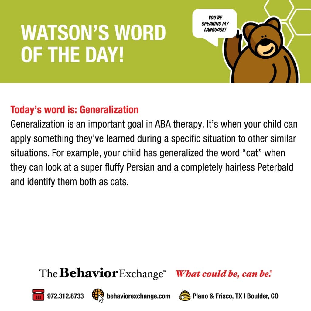 Generalization is an important goal in ABA therapy. It’s when your child can apply something they’ve learned during a specific situation to other similar situations. For example, your child has generalized the word “cat” when they can look at a super fluffy Persian and a completely hairless Peterbald and identify them both as cats.