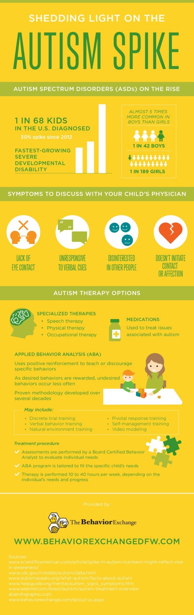 In recent years, the number of autism cases has spiked dramatically. In fact, since 2012, there has been a 30% increase in autism diagnoses. Why does autism seem to be on the rise? Although other factors may be at play, researchers believe that increased awareness plays a central role. This infographic from The Behavior Exchange breaks down the statistics about autism and explores the common treatment options, including Applied Behavior Analysis (ABA). You’ll also learn about some of the symptoms of autism. Help parents everywhere arm themselves with these important facts by sharing this information with your friends and family.