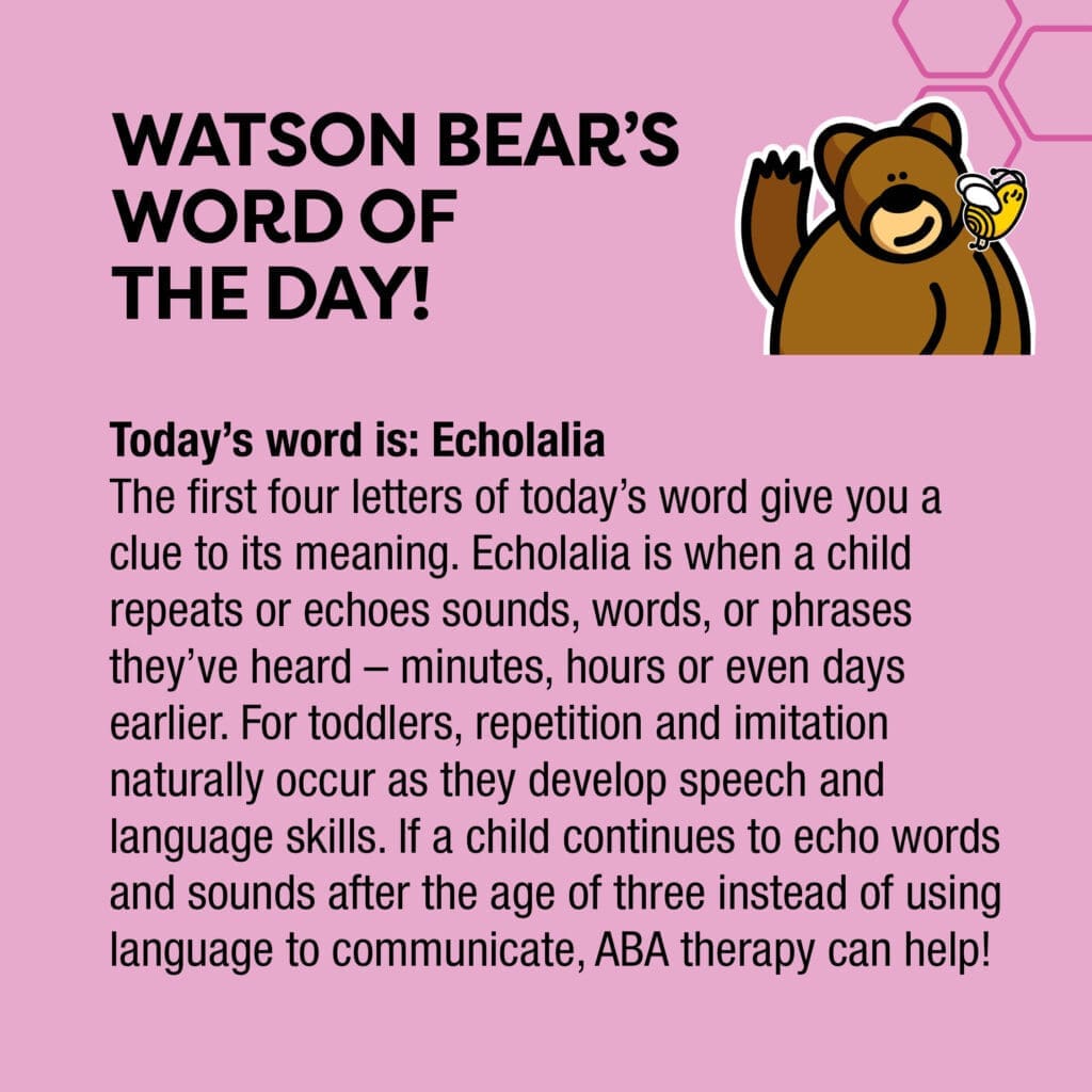 The first four letters of today’s word give you a clue to its meaning. Echolalia is when a child repeats or echoes sounds, words, or phrases they’ve heard – minutes, hours or even days earlier. For toddlers, repetition and imitation naturally occur as they develop speech and language skills. If a child continues to echo words and sounds after the age of three instead of using language to communicate, ABA therapy can help!